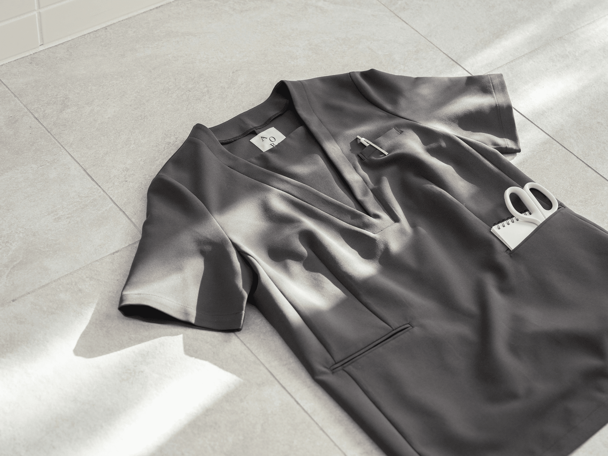 AOREのスクラブは、美容医療現場の声を取り入れ、激しい動きでも物が落ちにくく、かつシルエットを崩さないポケット配置が特徴です。
