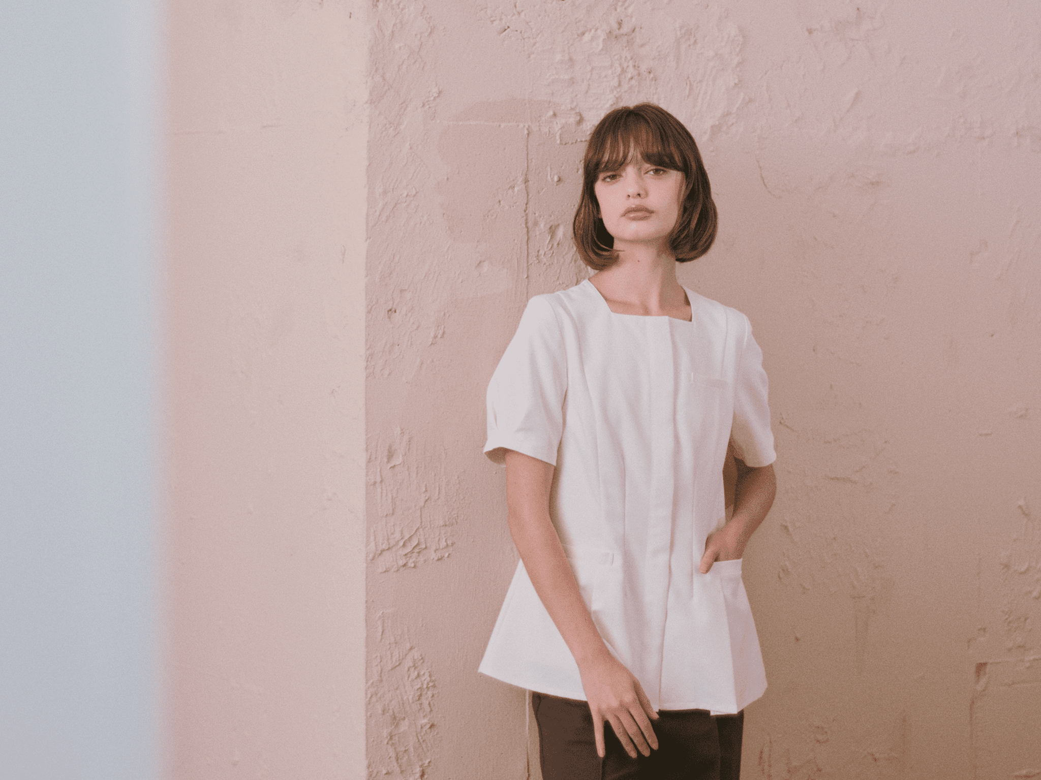 身体のラインを拾いすぎない、ゆったりとしたリラックス感のあるボックスシルエットが特徴のスクラブです。ジャケットを着ているような凛とした印象を演出できます。また、後ろにはスリットを入れ、動きやすさにもこだわっています。
